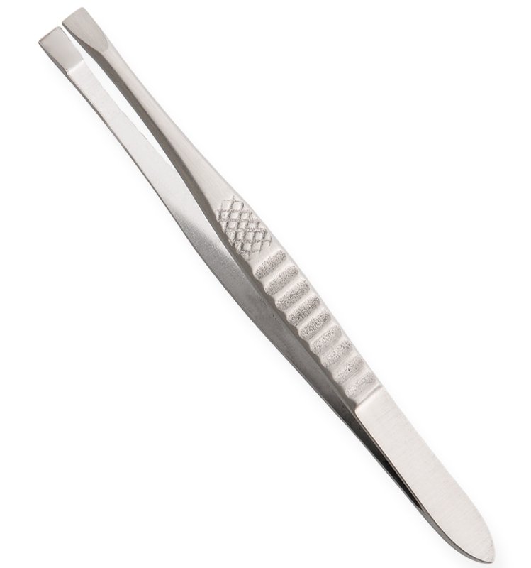 Eyebrow Tweezers Texture on Handle, Straight Available Sizes. 10 cm Details. All tweezers are made of superior quality stainless steel J1/410, HRC° (hardness) 43° – 45°. Beautifully designed top quality stainless steel. This all purpose tweezers is ideal for facial hairs, bikini lines and other unwanted body hair. Available in slanted, straight and pointed tips