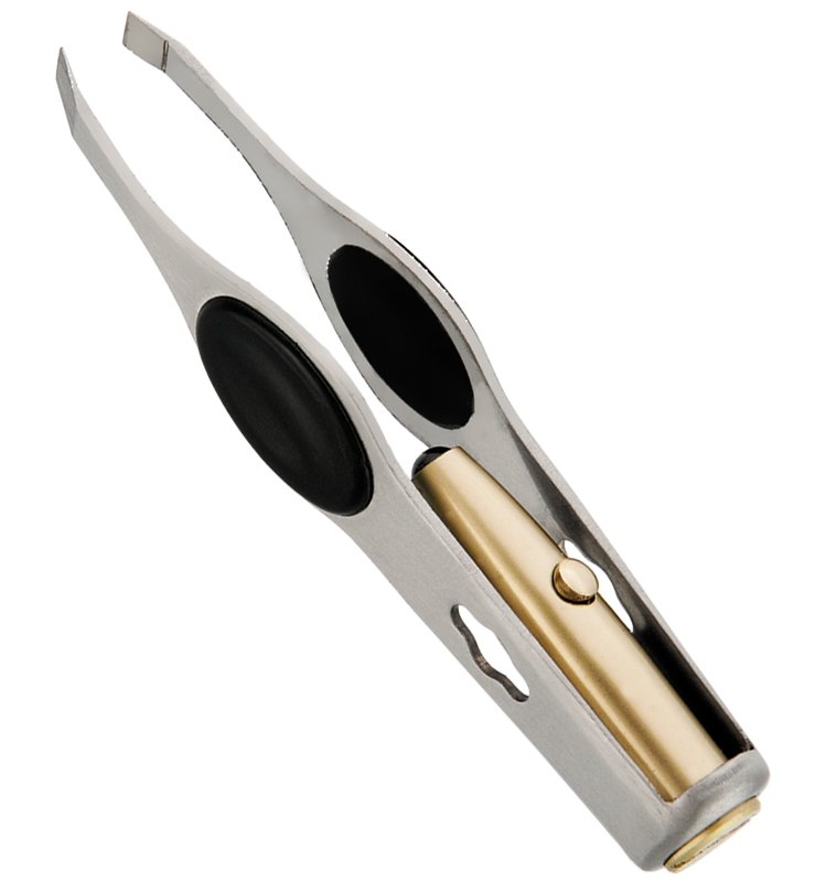 Eyebrow Tweezers with Light and Rubber Pad Available Sizes. 10 cm Details. All tweezers are made of superior quality stainless steel J1/410, HRC° (hardness) 43° – 45°. Beautifully designed top quality stainless steel. This all purpose tweezers is ideal for facial hairs, bikini lines and other unwanted body hair. Available in slanted, straight and pointed tips