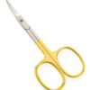 Available Sizes. 3.5 in Details. All scissors are made of superior quality stainless steel 410, HRC° (hardness) 45° – 48°. Available in Blister Packing, Pouches and Plastic Bags. Cuticle Scissors Half Gold Platted Curved, Adjustable Screw