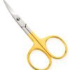 Available Sizes. 3.5 in Details. All scissors are made of superior quality stainless steel 410, HRC° (hardness) 45° – 48°. Available in Blister Packing, Pouches and Plastic Bags. Nail Scissors Half Gold Platted Curved, Adjustable Screw